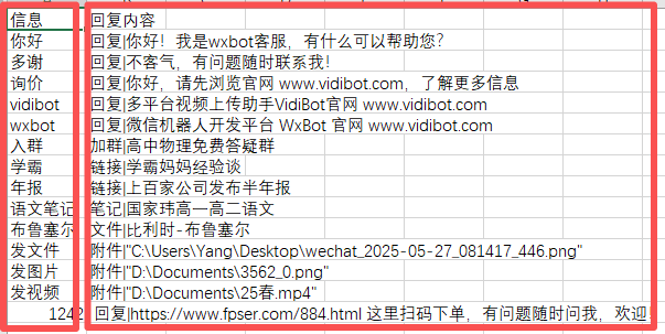 ① 信息:“你好” “多谢” ….“语文笔记”、“发文件”、“发视频” 这些都是定义收到的信息文本,如果匹配,就执行右侧的响应动作和内容;